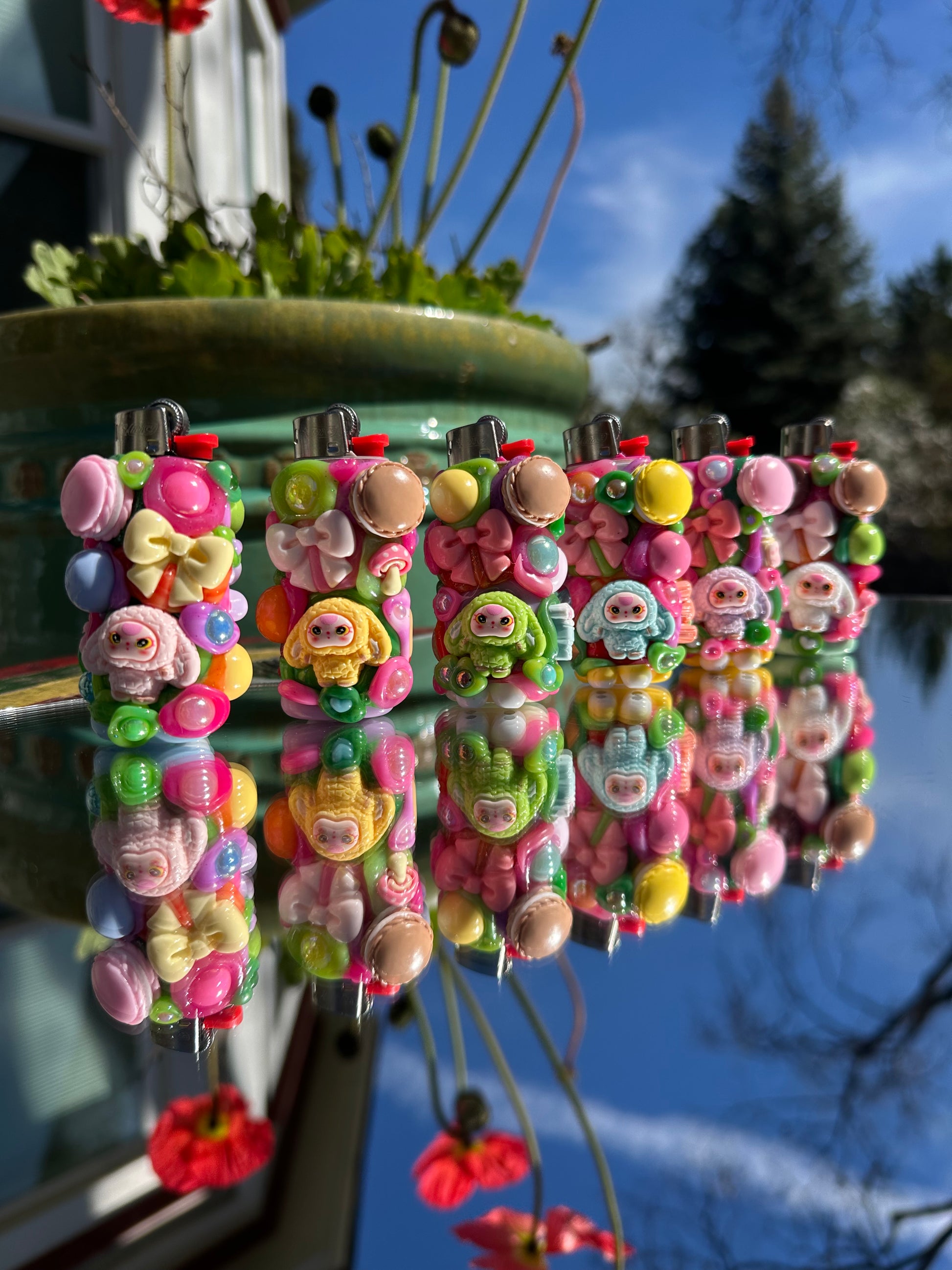 Each one is a handmade decorative mini lighter case with colorful details, soft sparkle, and a tiny attitude all its own.
