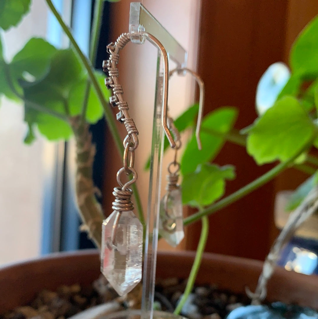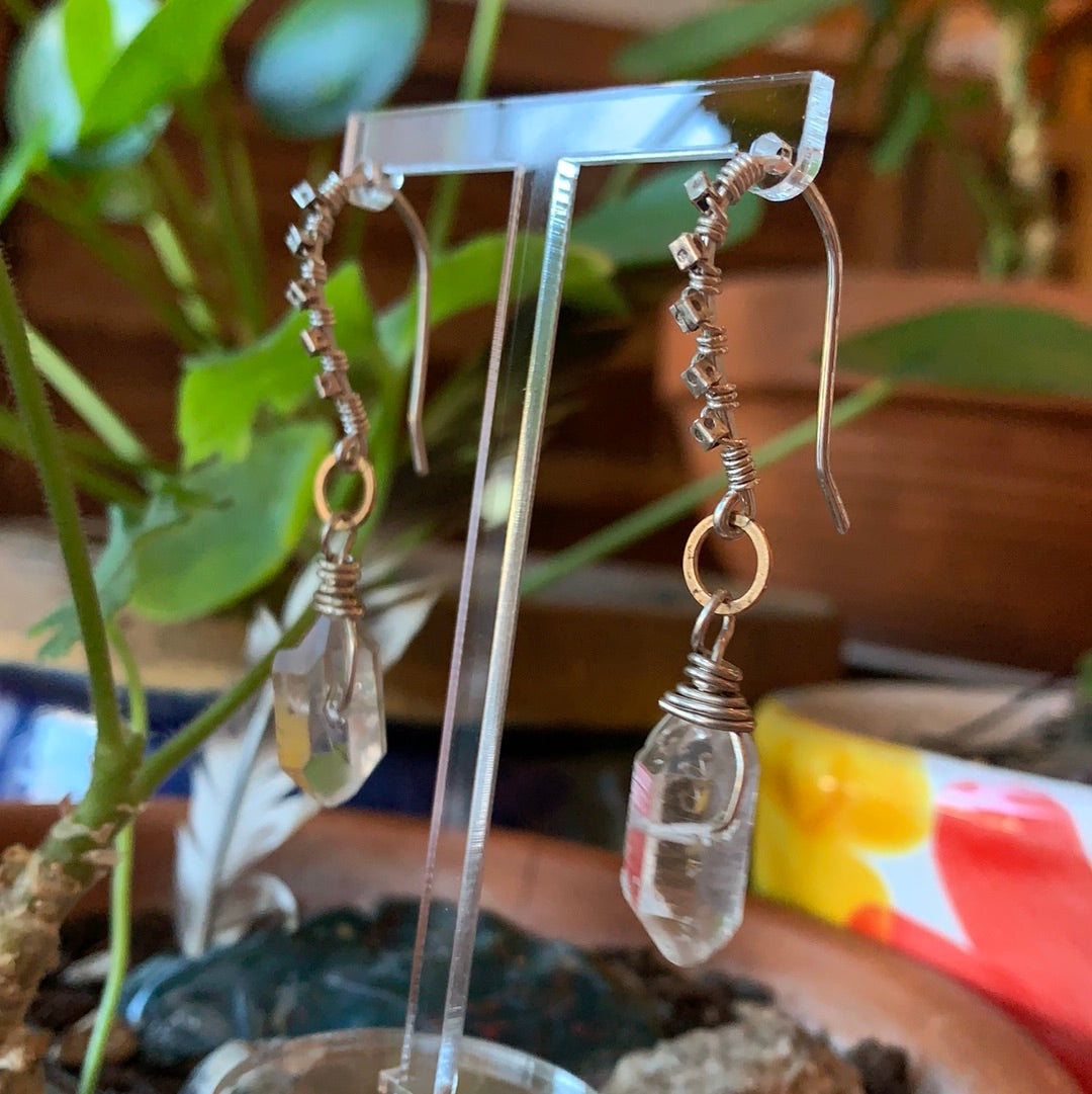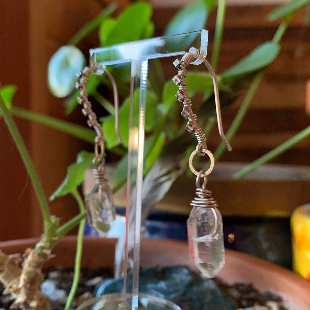Part of my Wire Wrapped Collection these little babies were crafted with lots of love. The ear wires are hand shaped and wrapped with Flower Stamped Hill Tribe Beads. Below the earwire hangs a beautiful 14kgf ring that drops a thickly wrapped Herkimer Diamond, mined sustainably from Herkimer, New York.