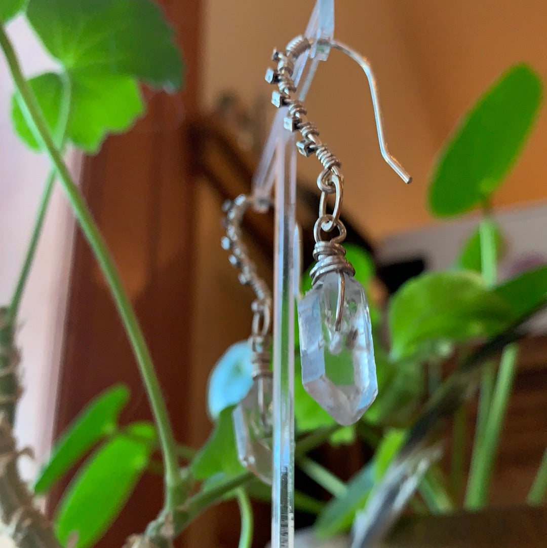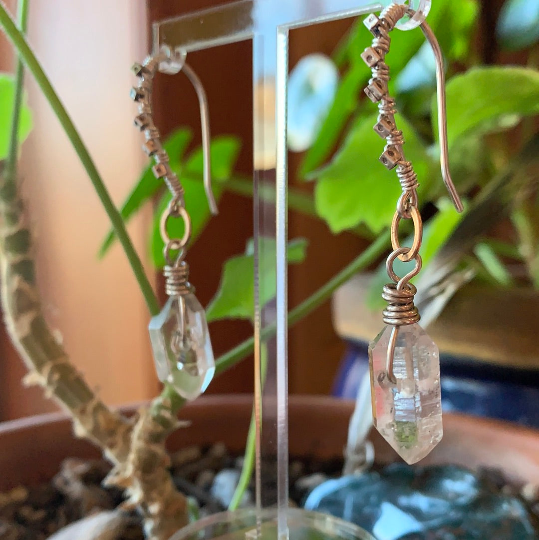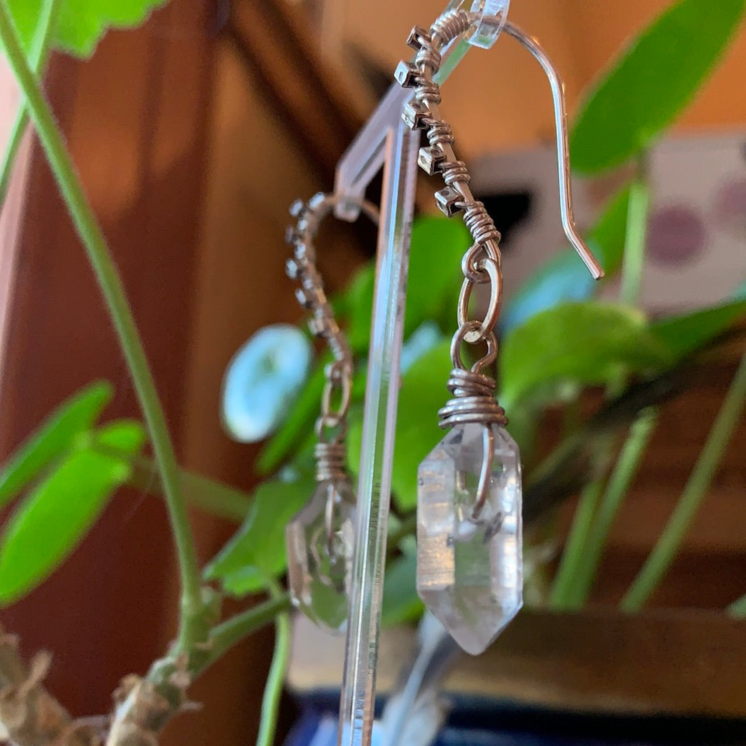 Part of my Wire Wrapped Collection these little babies were crafted with lots of love. The ear wires are hand shaped and wrapped with Flower Stamped Hill Tribe Beads. Below the earwire hangs a beautiful 14kgf ring that drops a thickly wrapped Herkimer Diamond, mined sustainably from Herkimer, New York.