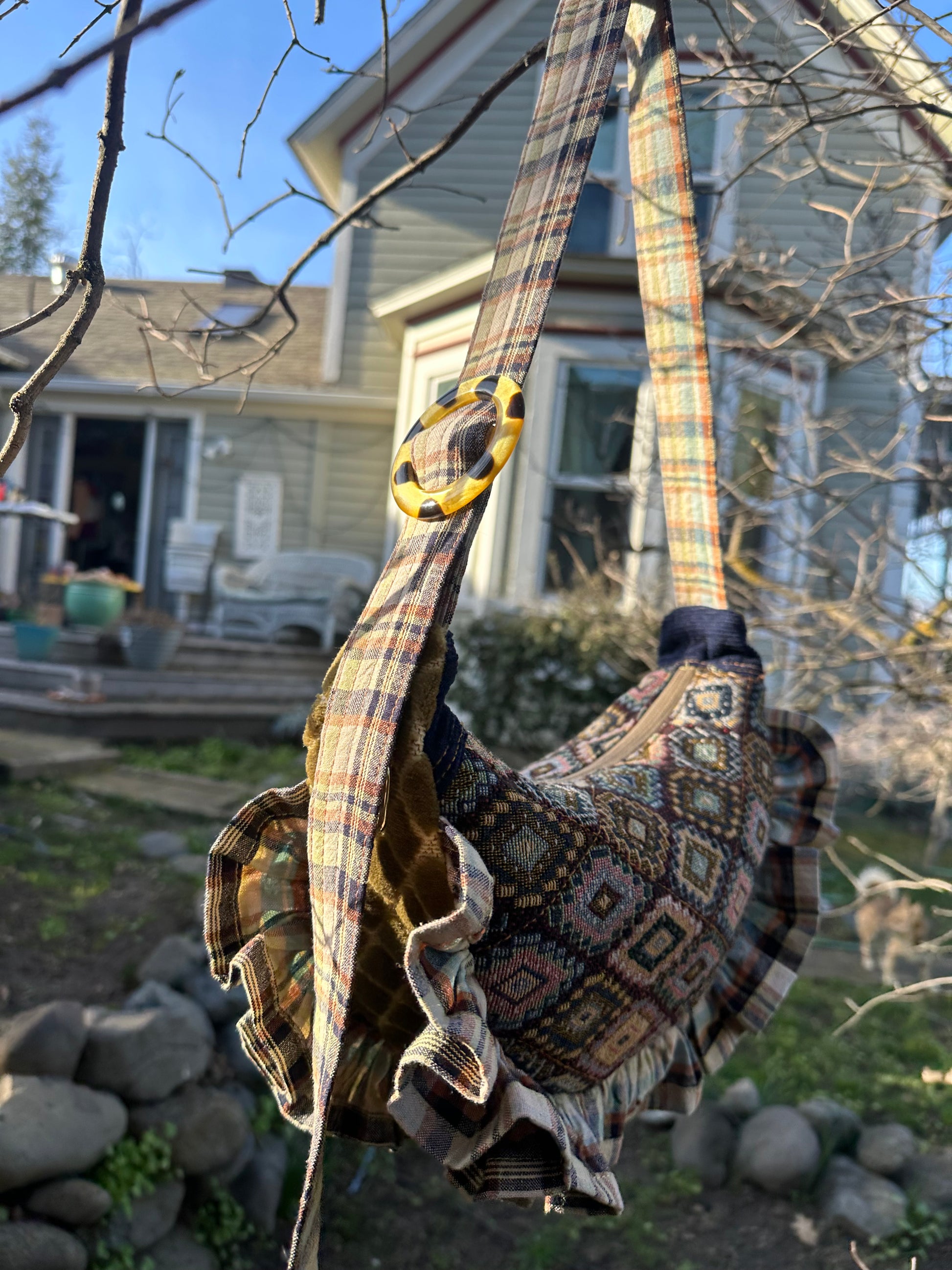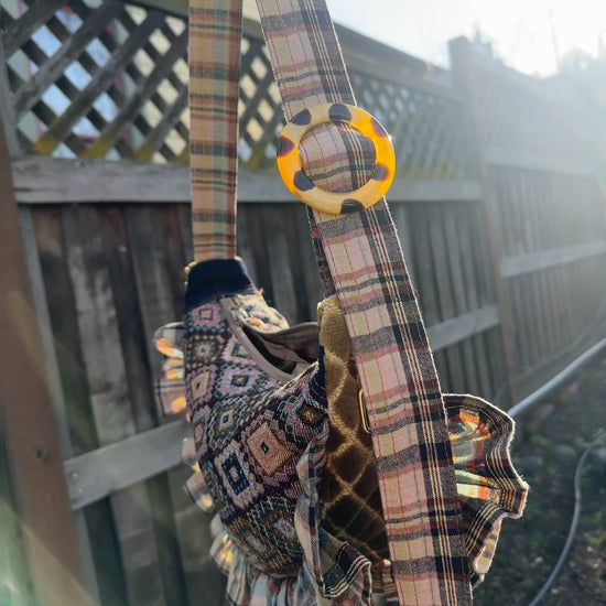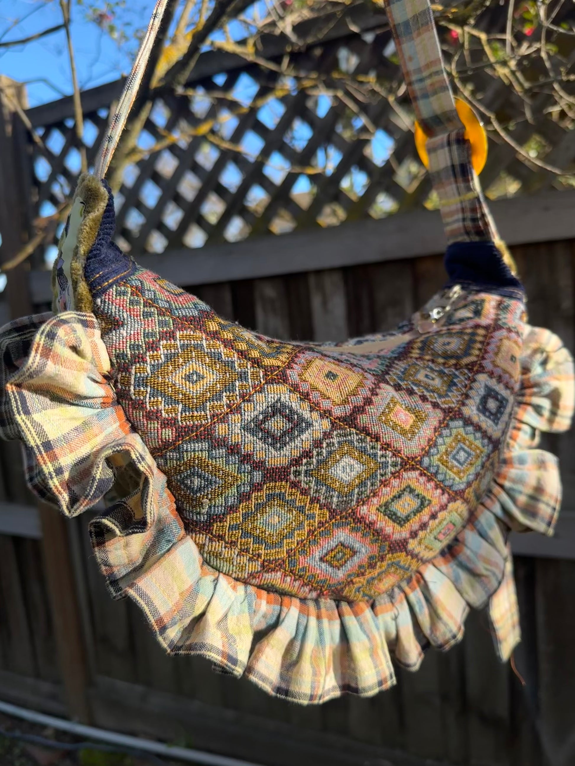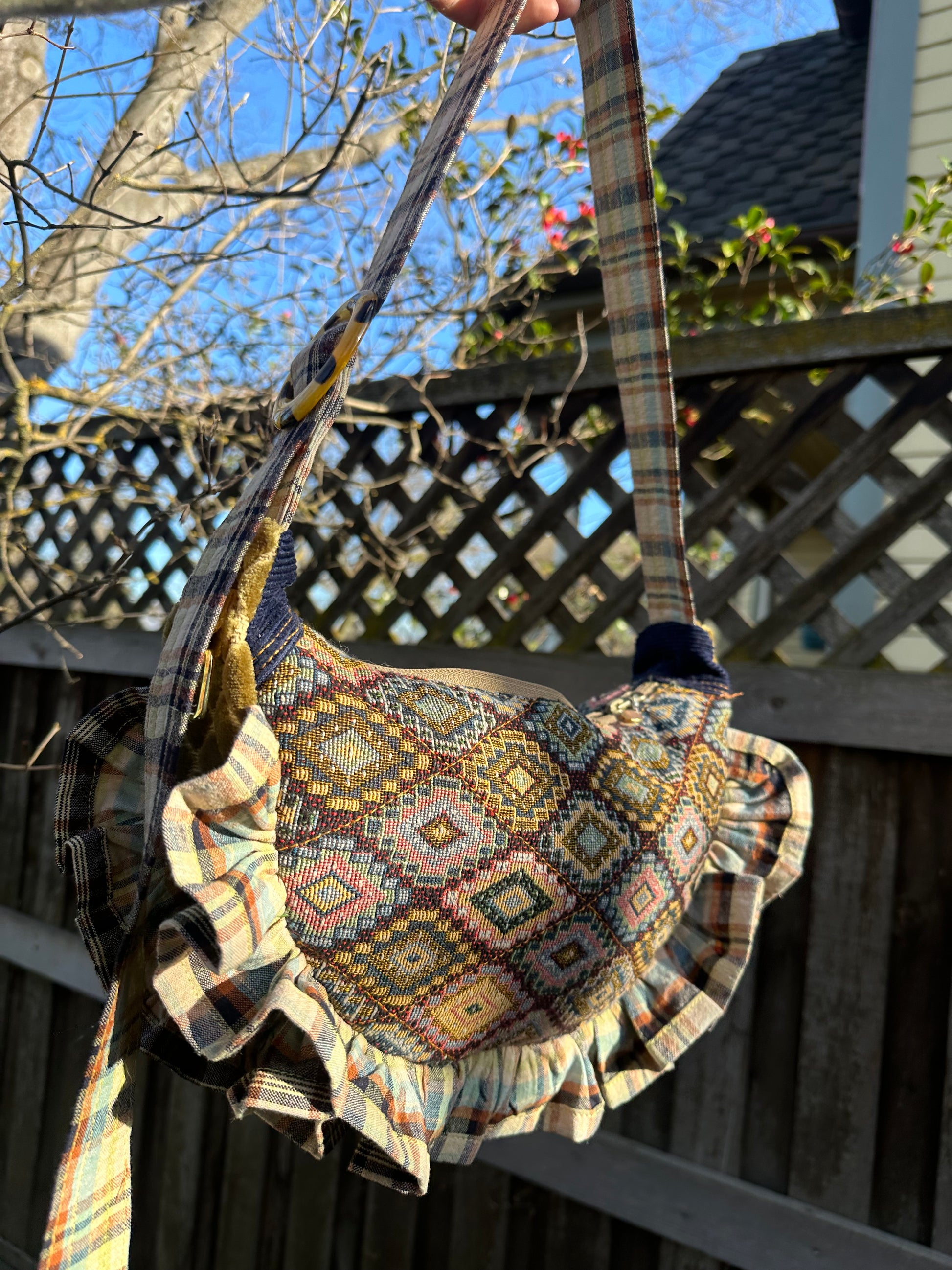 This small half moon bag is hand quilted with a beautiful diamond upholstery couch fabric, plus a playful touch of a vintage plaid ruffle. The chic buckle adds an adjustable and fun element to your look. Carry this bag and be ready to be the cutest girl in town!