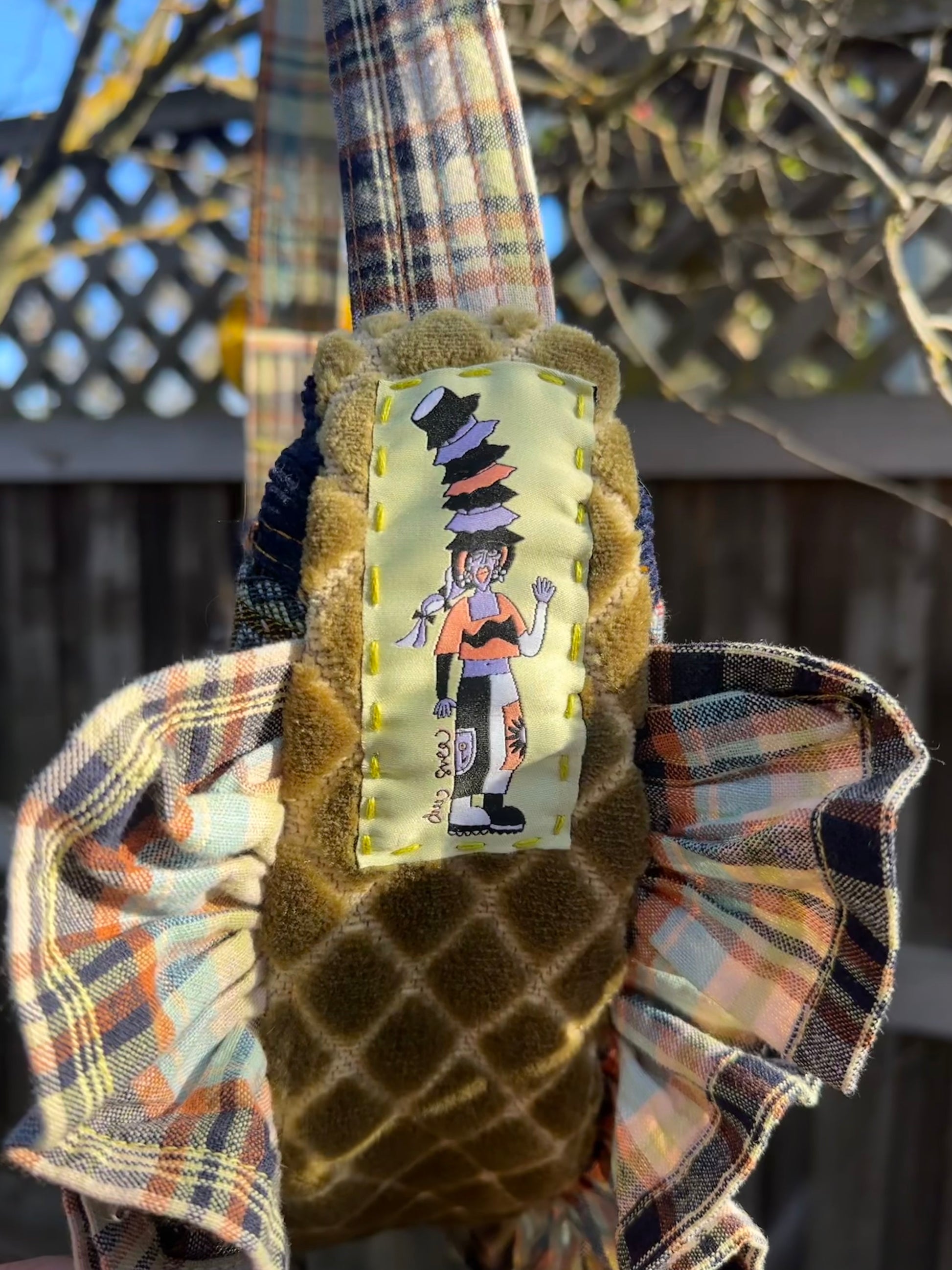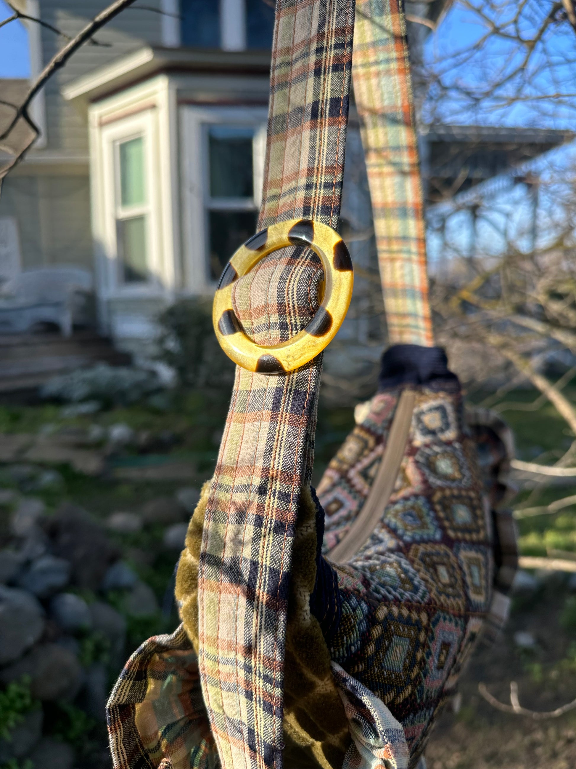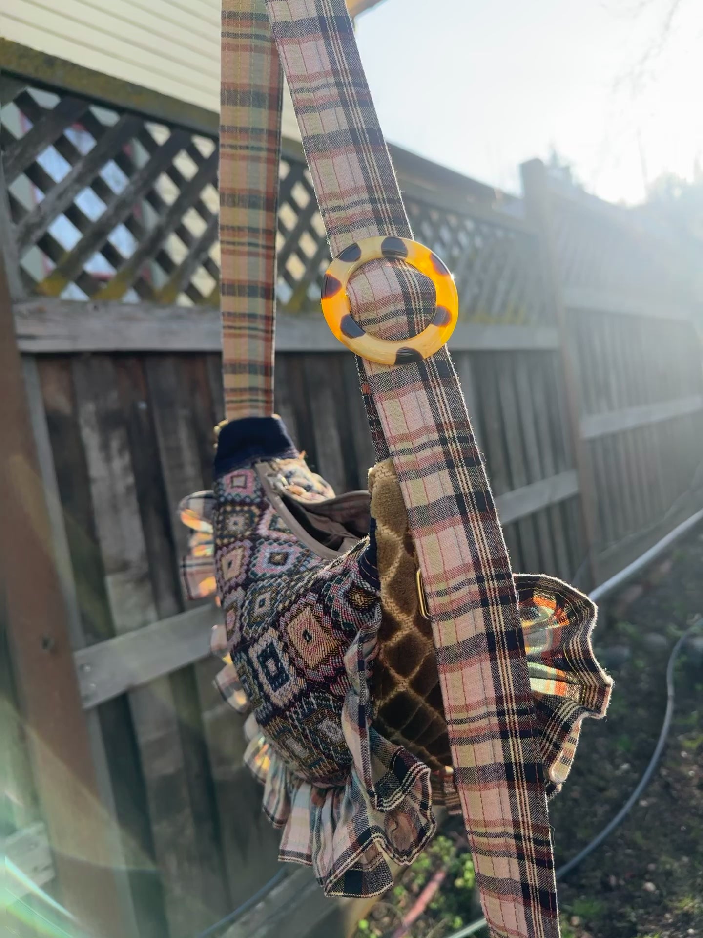 This small half moon bag is hand quilted with a beautiful diamond upholstery couch fabric, plus a playful touch of a vintage plaid ruffle. The chic buckle adds an adjustable and fun element to your look. Carry this bag and be ready to be the cutest girl in town!
