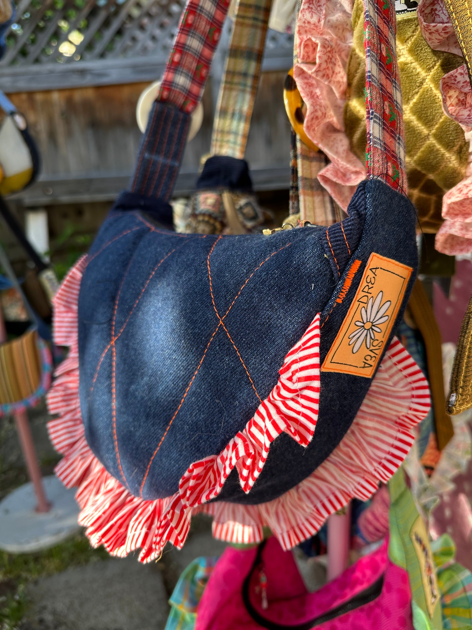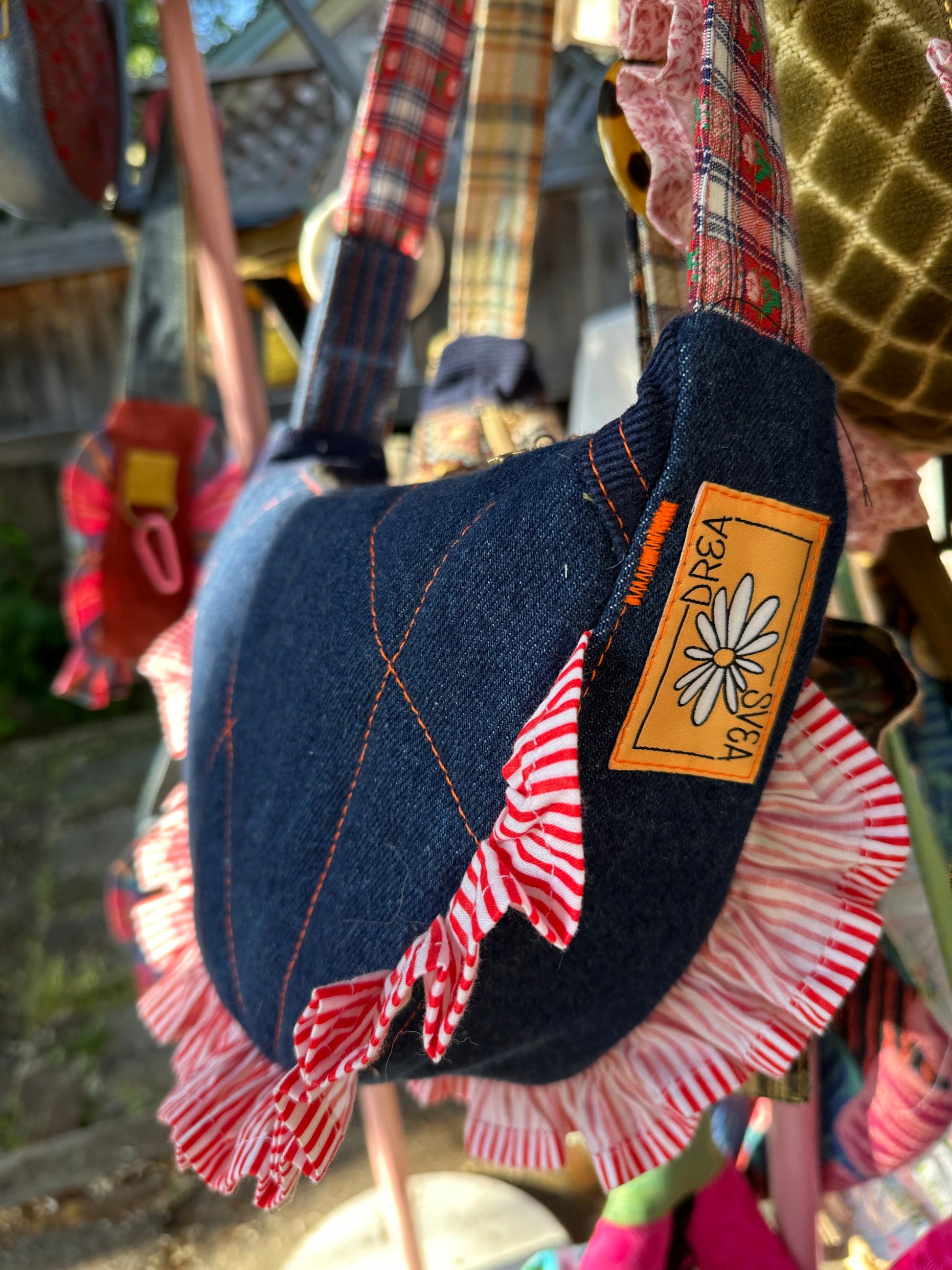 This small half-moon bag is hand-quilted from upcycled vintage indigo Levi’s denim, giving it rich texture and character. A playful vintage checkerboard strap adds contrast and charm, while the chic buckle offers adjustability and a touch of flair. Whether you’re strolling the boardwalk or dancing downtown, this bag guarantees you’ll be the cutest girl on land or at sea!