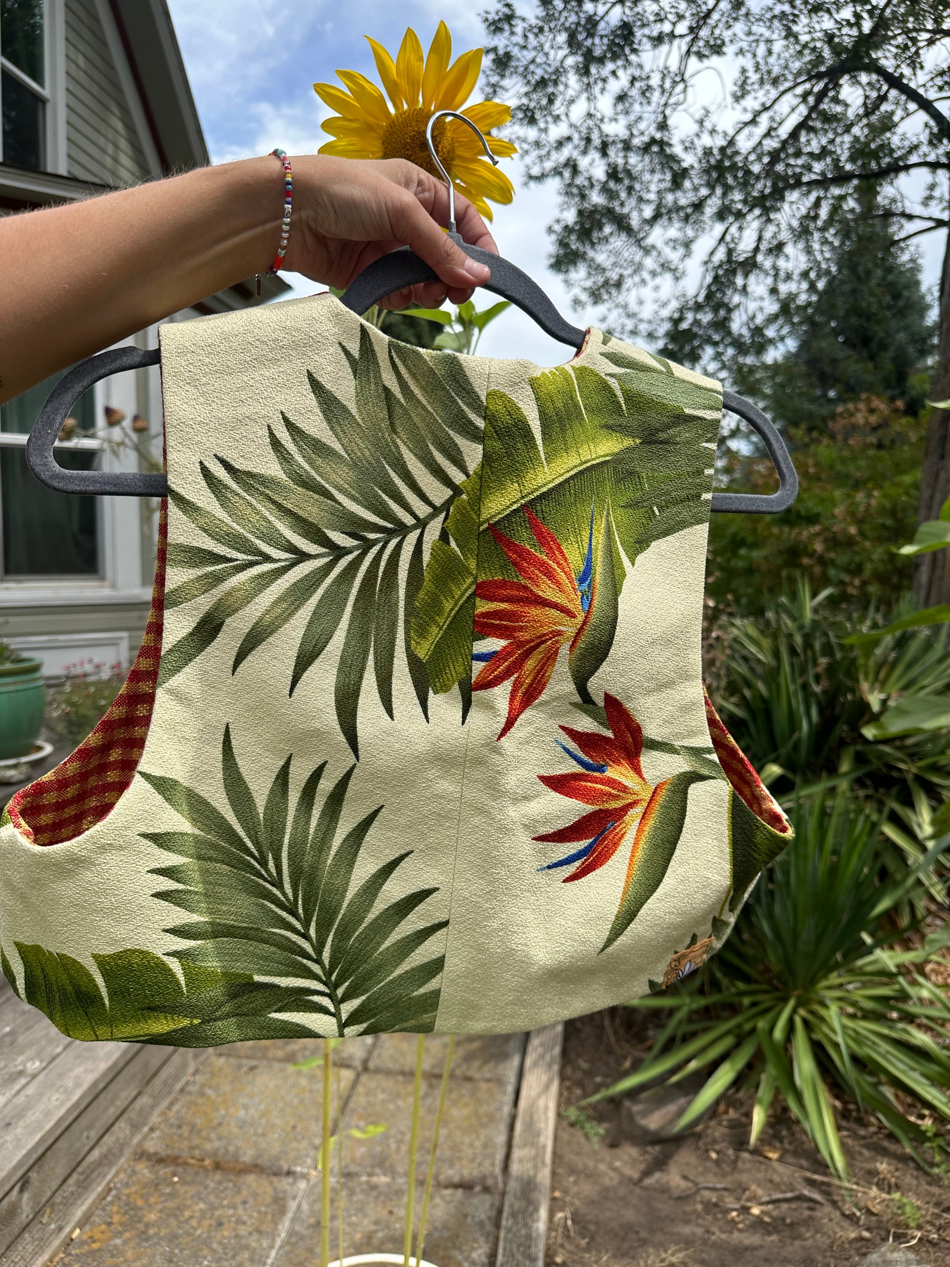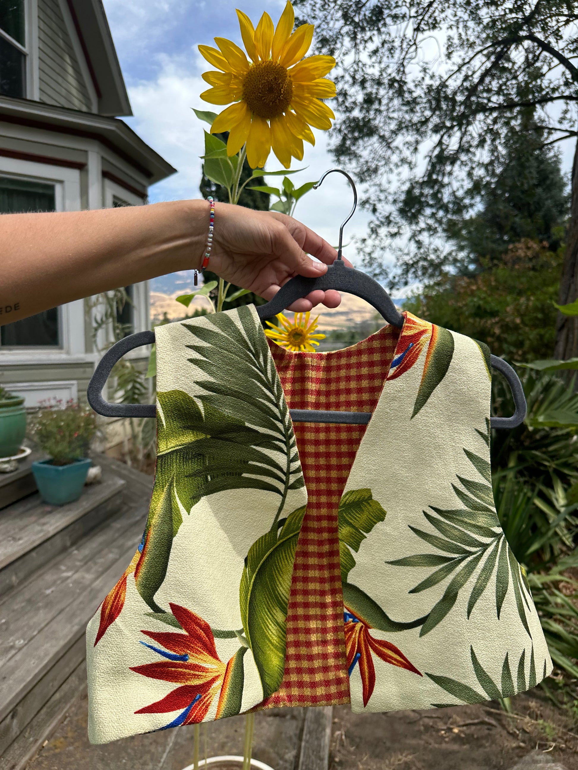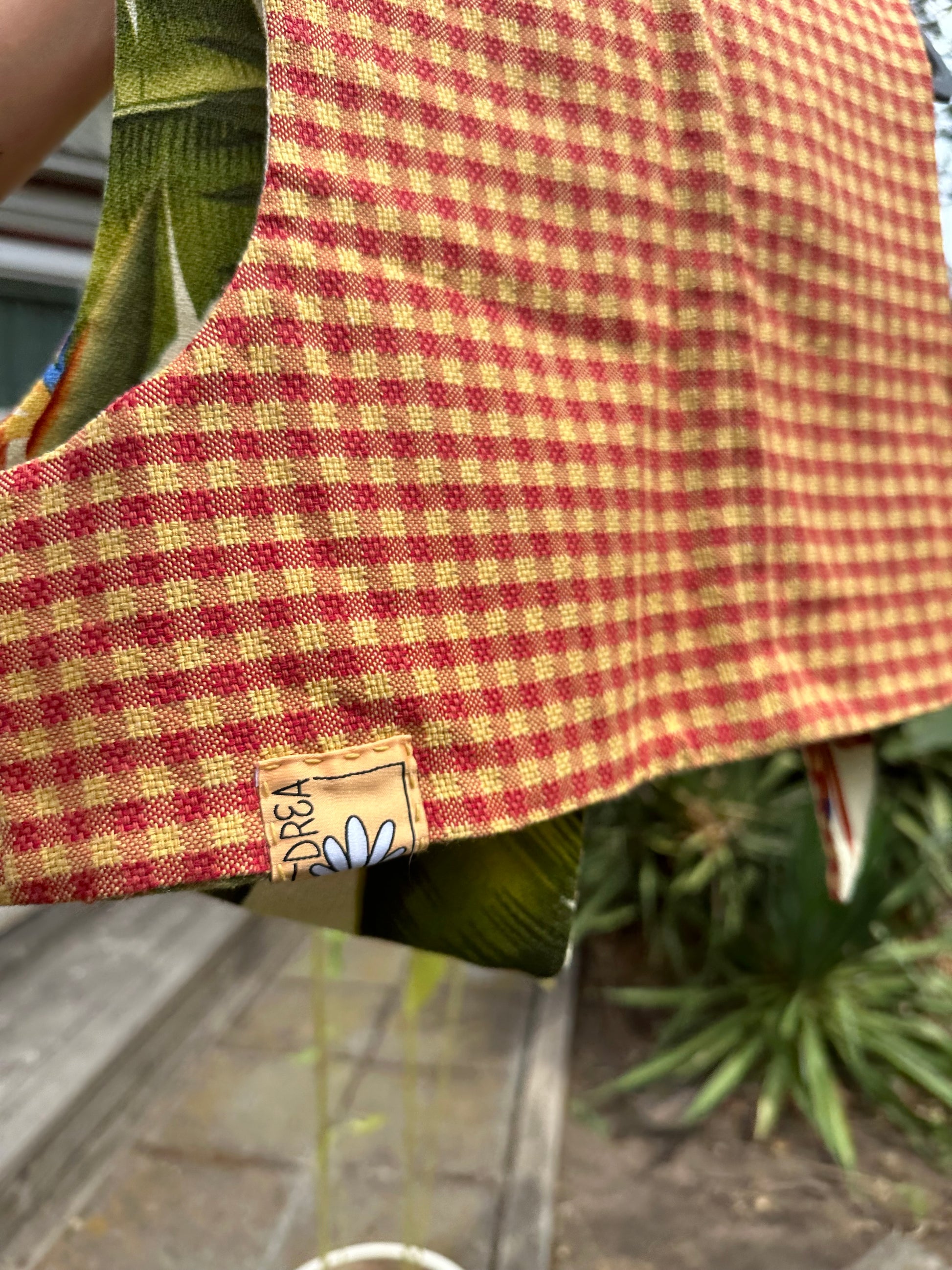 The floral side is Vintage Cotton 1970’s Birds of Paradise Print ~ and the flip gingham is Vintage 1960’s checkerboard red-orange/yellow 💚❤️🔥💛