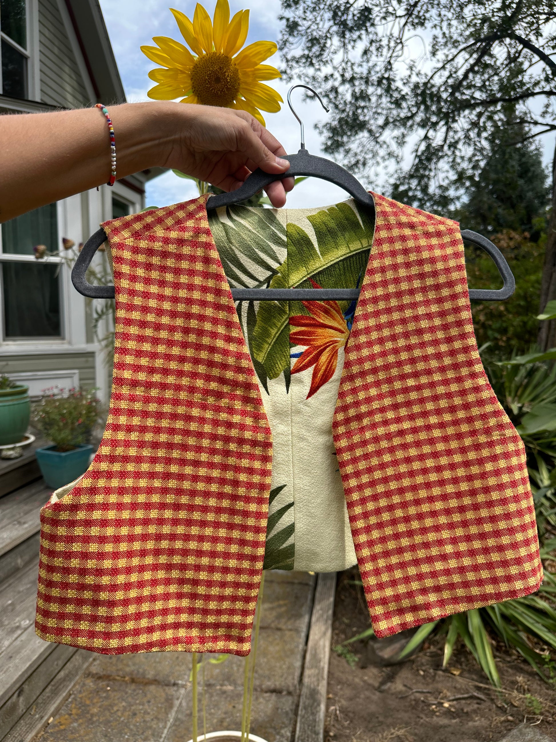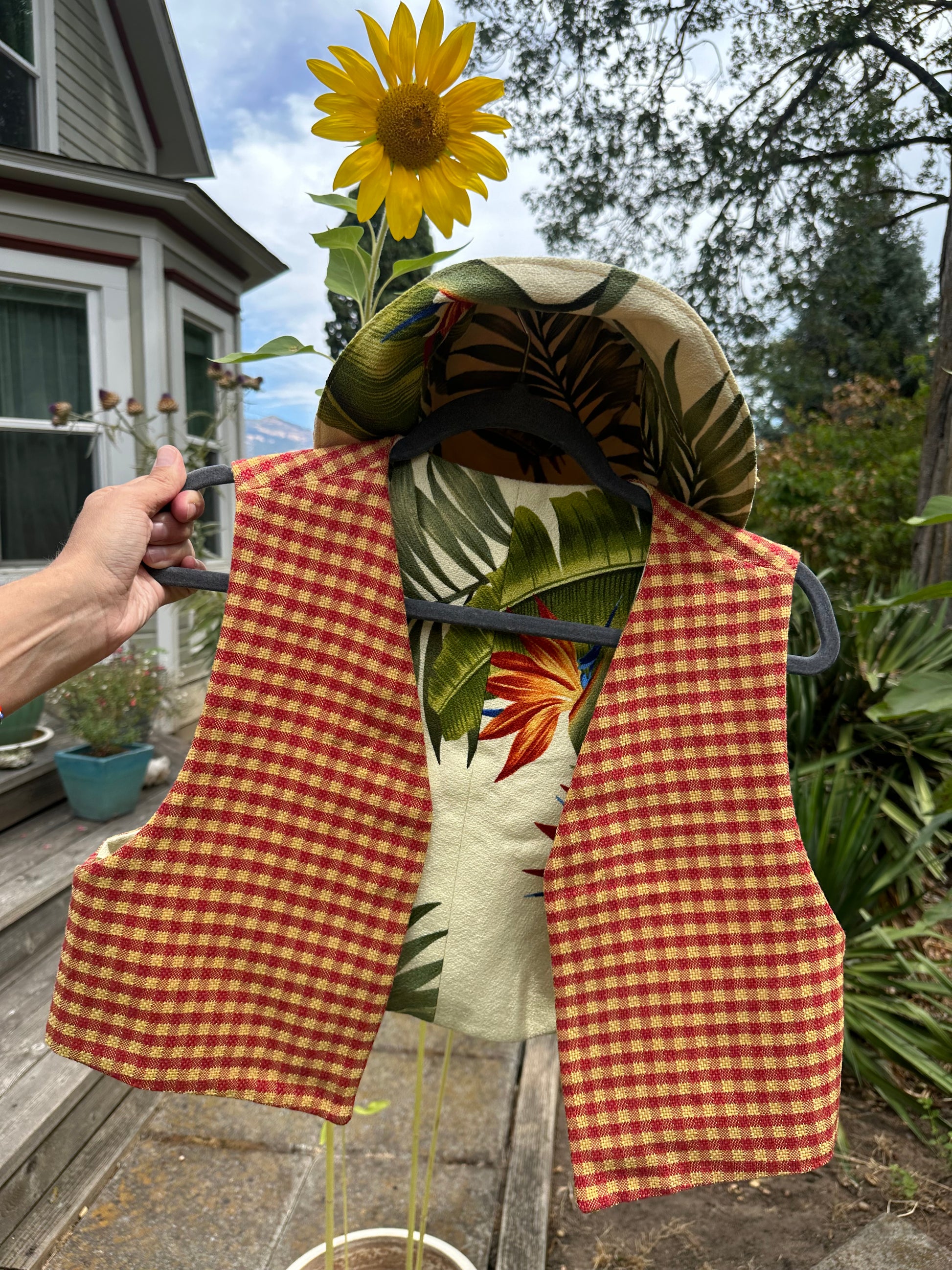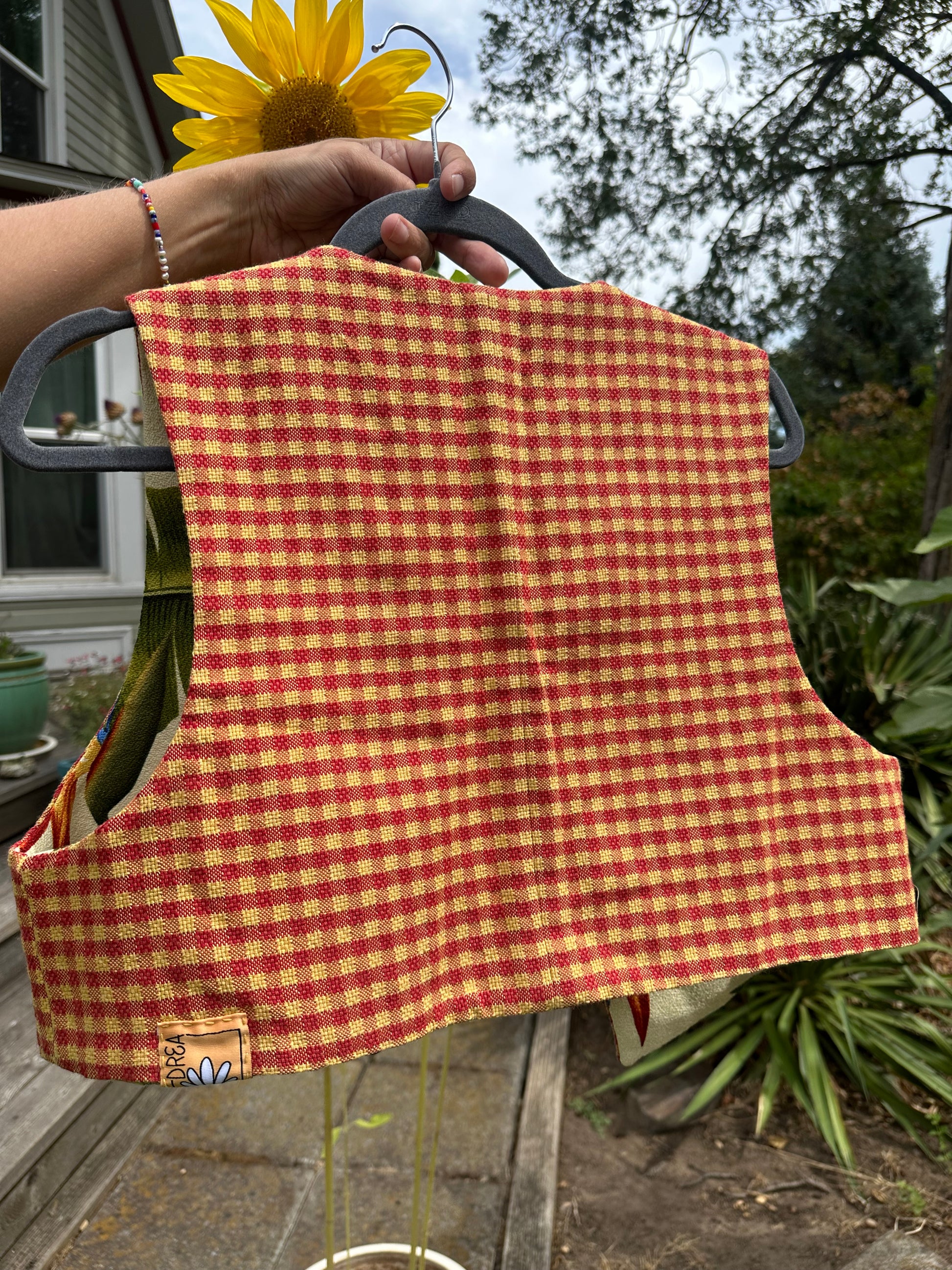 The floral side is Vintage Cotton 1970’s Birds of Paradise Print ~ and the flip gingham is Vintage 1960’s checkerboard red-orange/yellow 💚❤️🔥💛