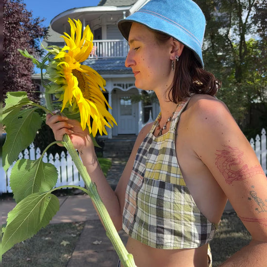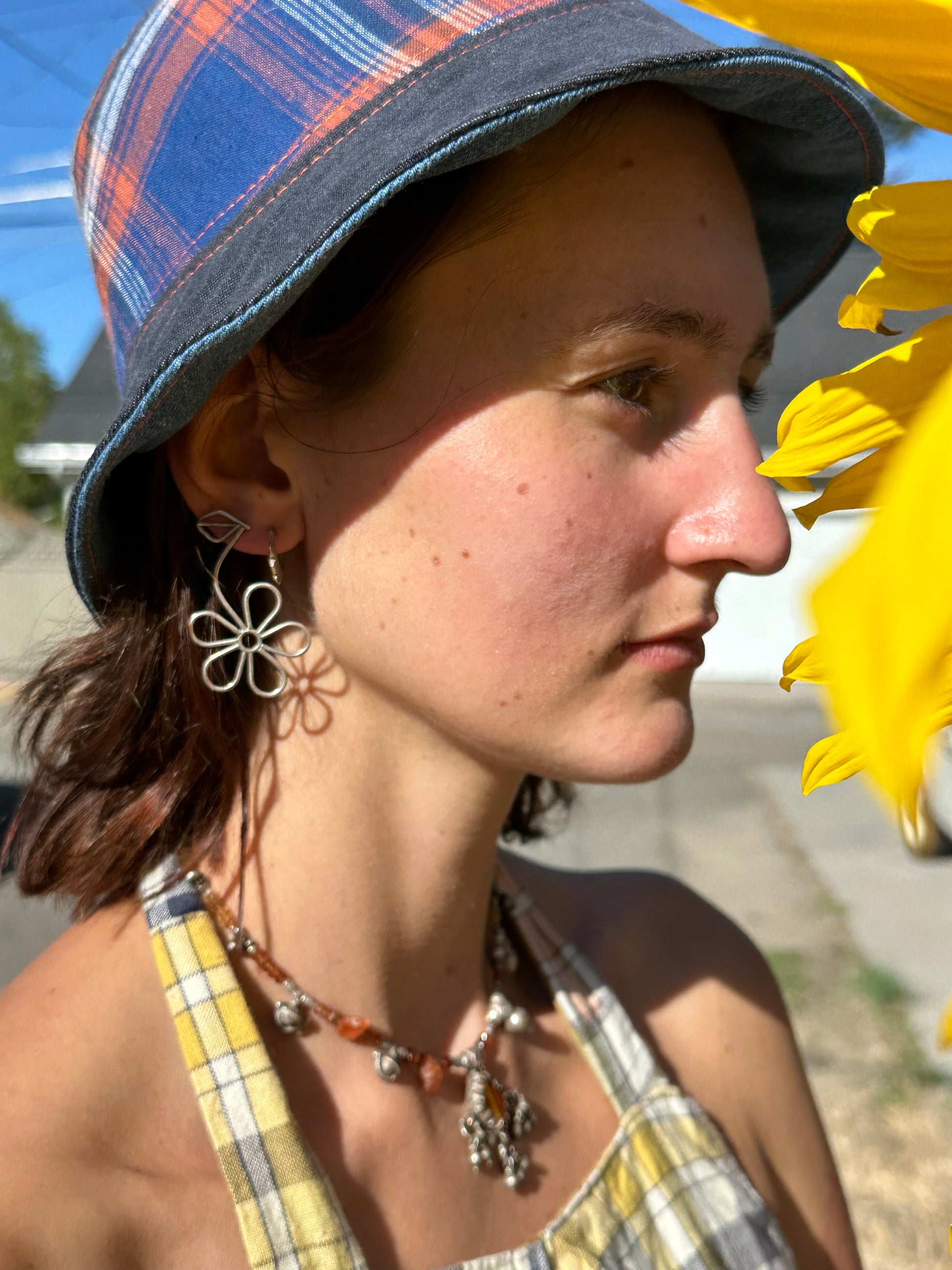 Then the other side is my wild child//brat side and is of course all vintage fabrics! These in particular came from my friends grandma Joyce ! Damn she had good taste (((also side note: was all sewn with her sowing machine from 1950’s//she still goes 🏎️🏇❤️🔥god bless something made*well))) A brim of soft yummy black cotton twill, a middle of Cozy Orange and Blue Flannel +++ a gorgeous Floral with Pomegrantes to top her off>>> to either keep you cozy -or/and- stylish~ pending which side is showing to the world.